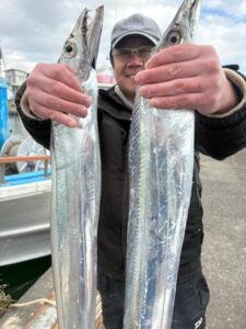 12月6日 釣果 本日は太刀魚釣り出船しました。 北東風がやや吹いて横波でクタクタの状況でした。 開始より好調で明るくなっても続いて最後まで楽しめました。 又、良型が多く各人5本指が3~5本釣れていました。 釣果 太刀魚指3本~5本 27~56匹